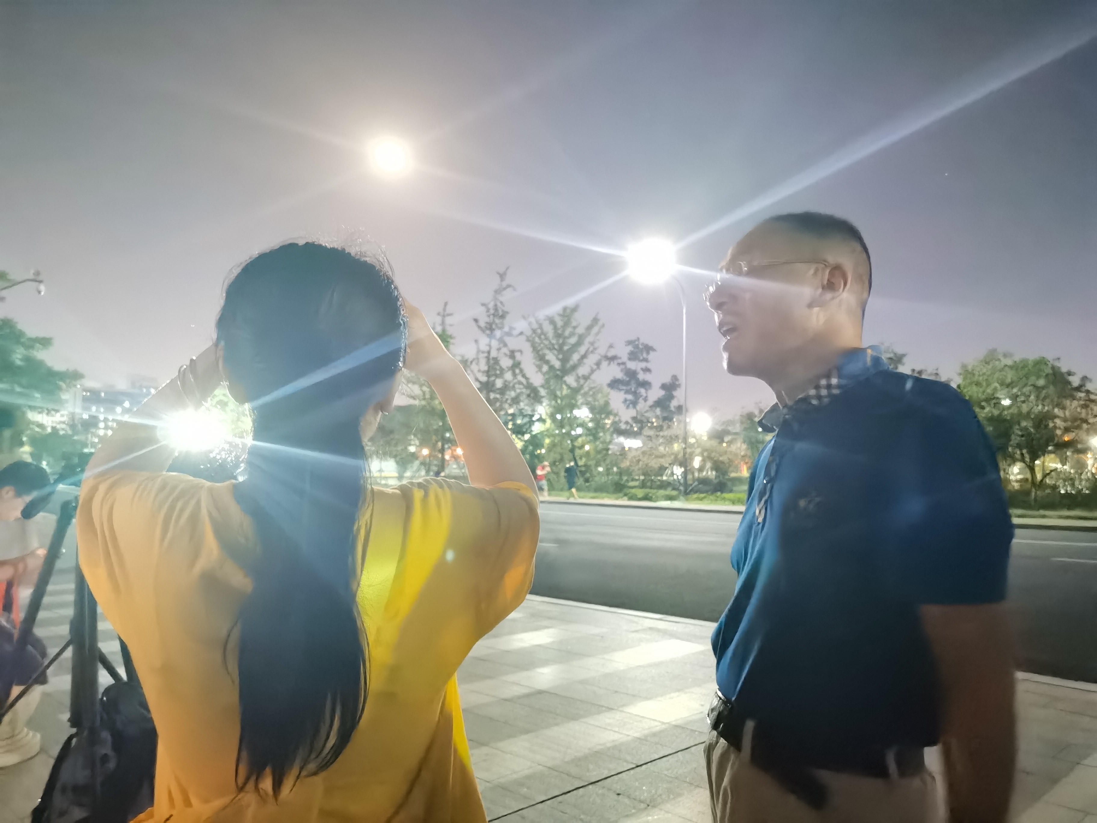 为了提升活动的专业性和趣味性,果冻传媒 教工第一党支部的陈久和老师带来了两只天文望远镜,并亲自担任活动的讲解员,将他的《地球和宇宙》课程讲坛从教室搬到了广场上。