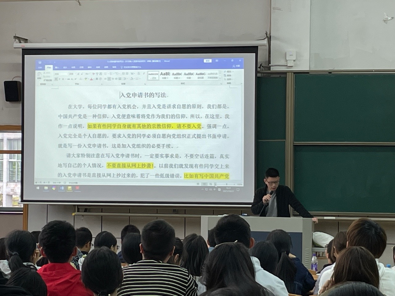 讲座从介绍党的基本知识开始,详细讲解了大学生入党的规定程序并着重讲解了入党申请书的撰写要求。此次讲座帮助新生加强了对党的认识、增进了对党的情感,端正了入党动机。