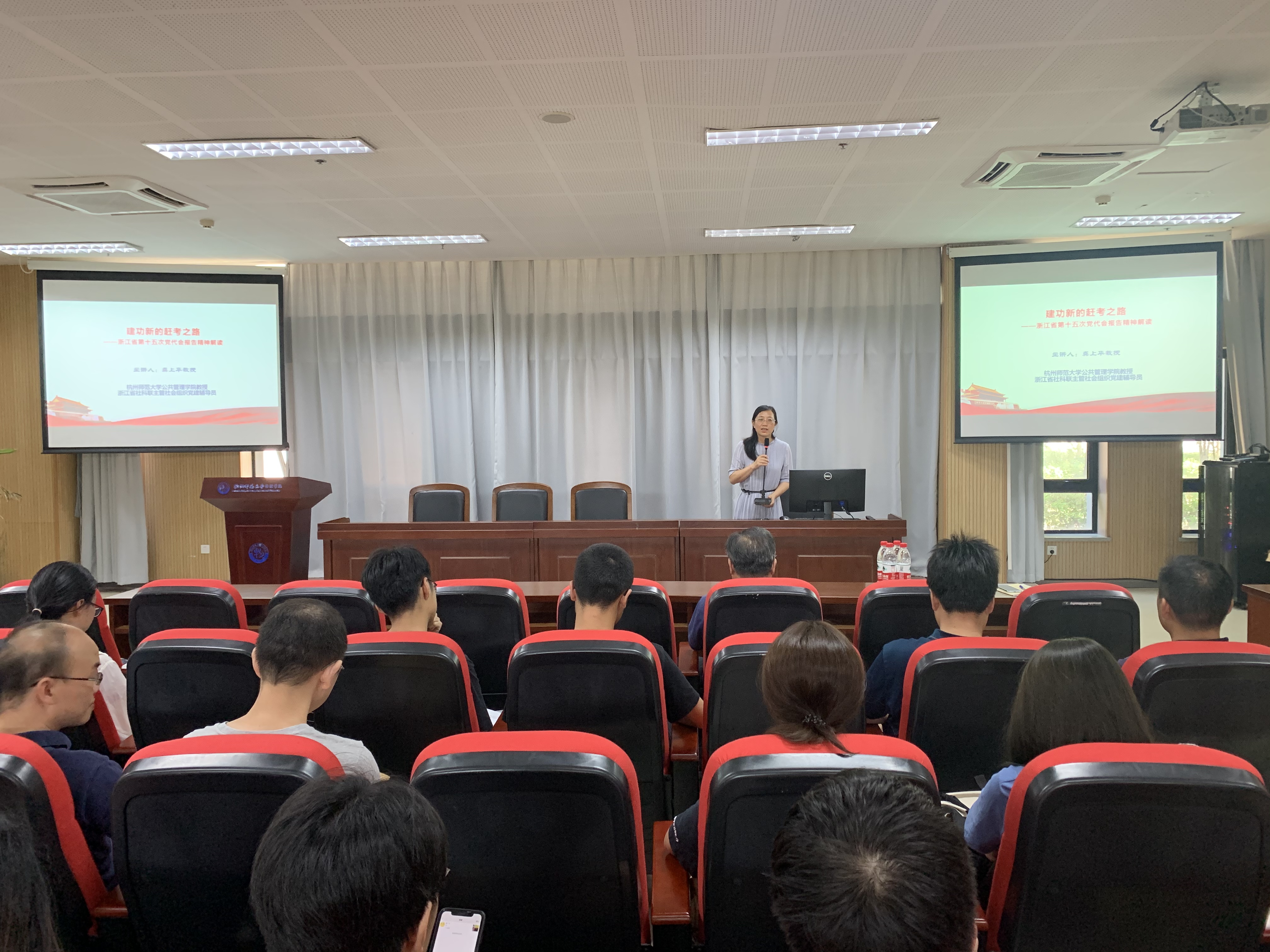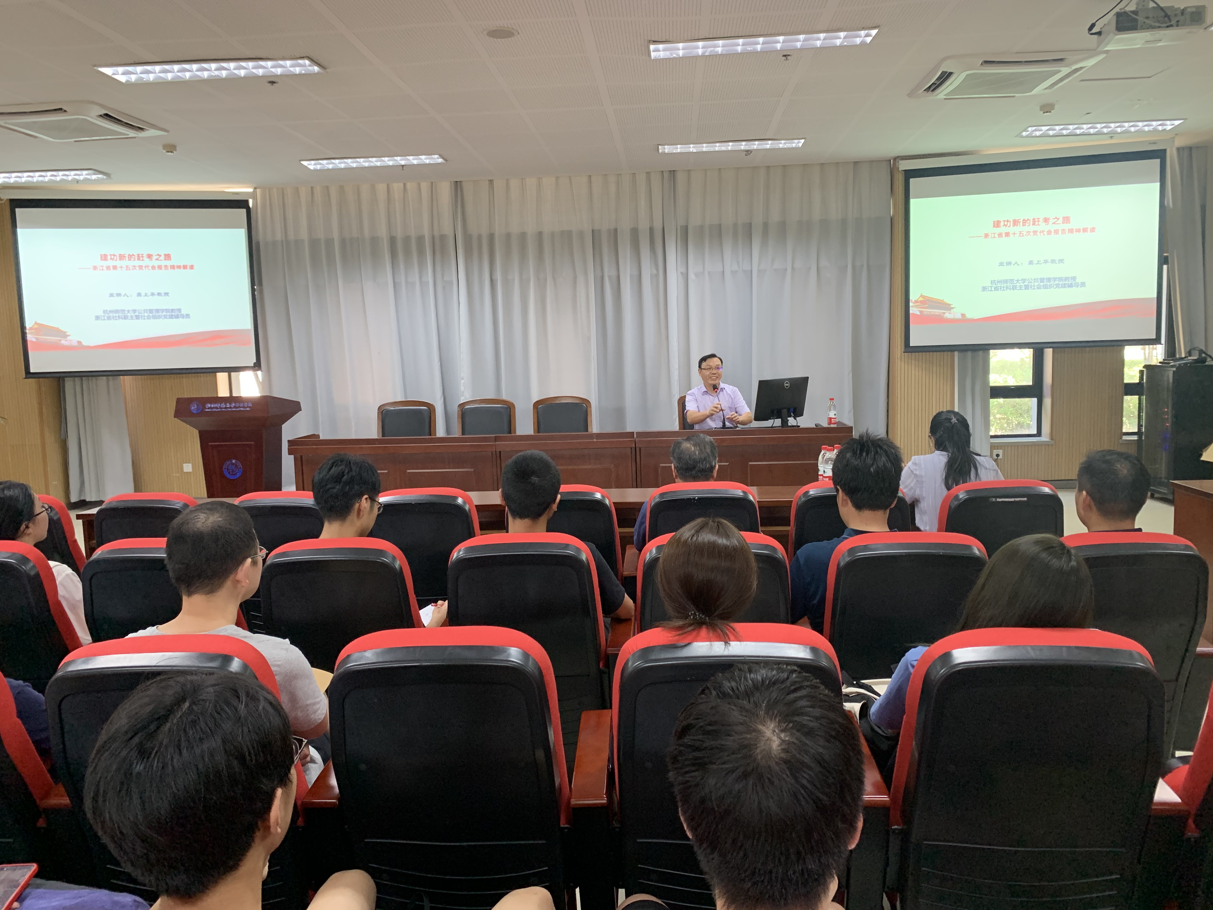 首先,浙江省社科联主管社团党建辅导员、杭州师范大学公共管理学院副院长龚上华教授以《建功新的赶考之路——浙江省第十五次党代会报告精神解读》为题,作了一次深刻的辅导报告。报告结合浙江省情与新世纪党代会省域定位,在回顾过去五年赶考成就的基础上,解码过去5年成功的“浙江密码”;更是以“28510”数字化、形象化地解读了未来五年的目标……始终紧扣“两个维护”、“两个大局”、“两个先行”三个关键词,指出唯有坚定不移沿着总书记指引的方向奋勇前进,才能闯出新路、不负使命。