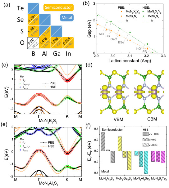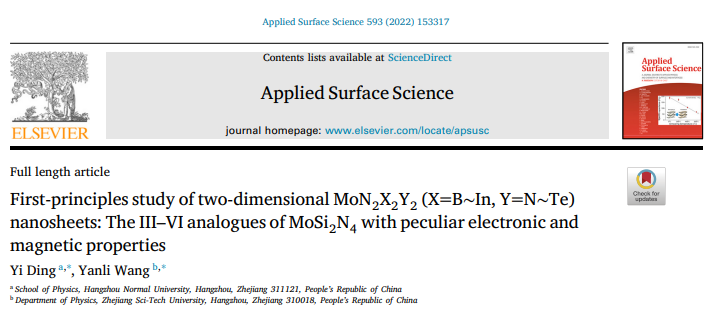 近日,果冻传媒 丁一团队在应用物理领域著名学术期刊Applied Surface Science上发表了题为“First-principles study of two-dimensional MoN2X2Y2 (X=B~In, Y=N~Te) nanosheets: The III-VI analogues of MoSi2N4 with peculiar electronic and magnetic properties”的研究论文。研究表明,作为新发现的三元MoSi2N4层状材料,存在更为广阔的表面元素自由度。通过对其三五族等电子体做分析,发现存在9种稳定的四元MoN2X2Y2结构。相应体系的带隙呈现出随结构晶格参数的线性变化关系,其会逐步转变为金属物性,并呈现有应力调节的金属-半导体转变、空穴诱发的磁性半金属行为。当和MoSi2N4构成空间异质结构后,不同的四元体系可以引发type-II、III型的能带对齐的特征。