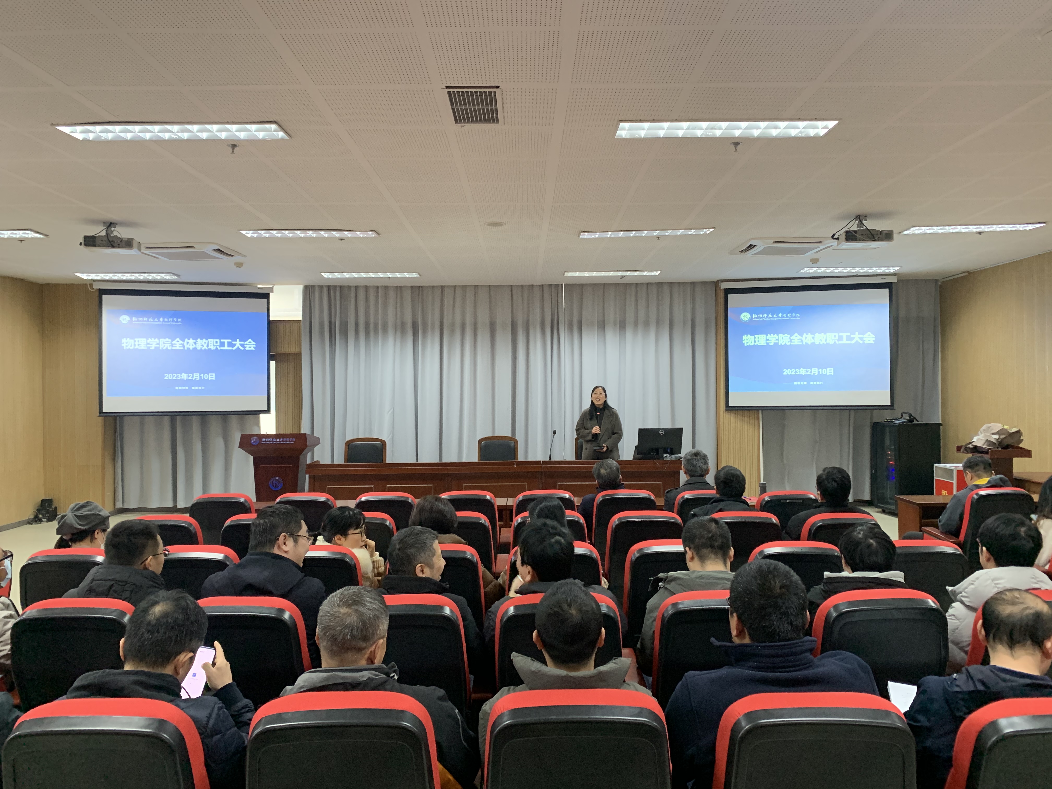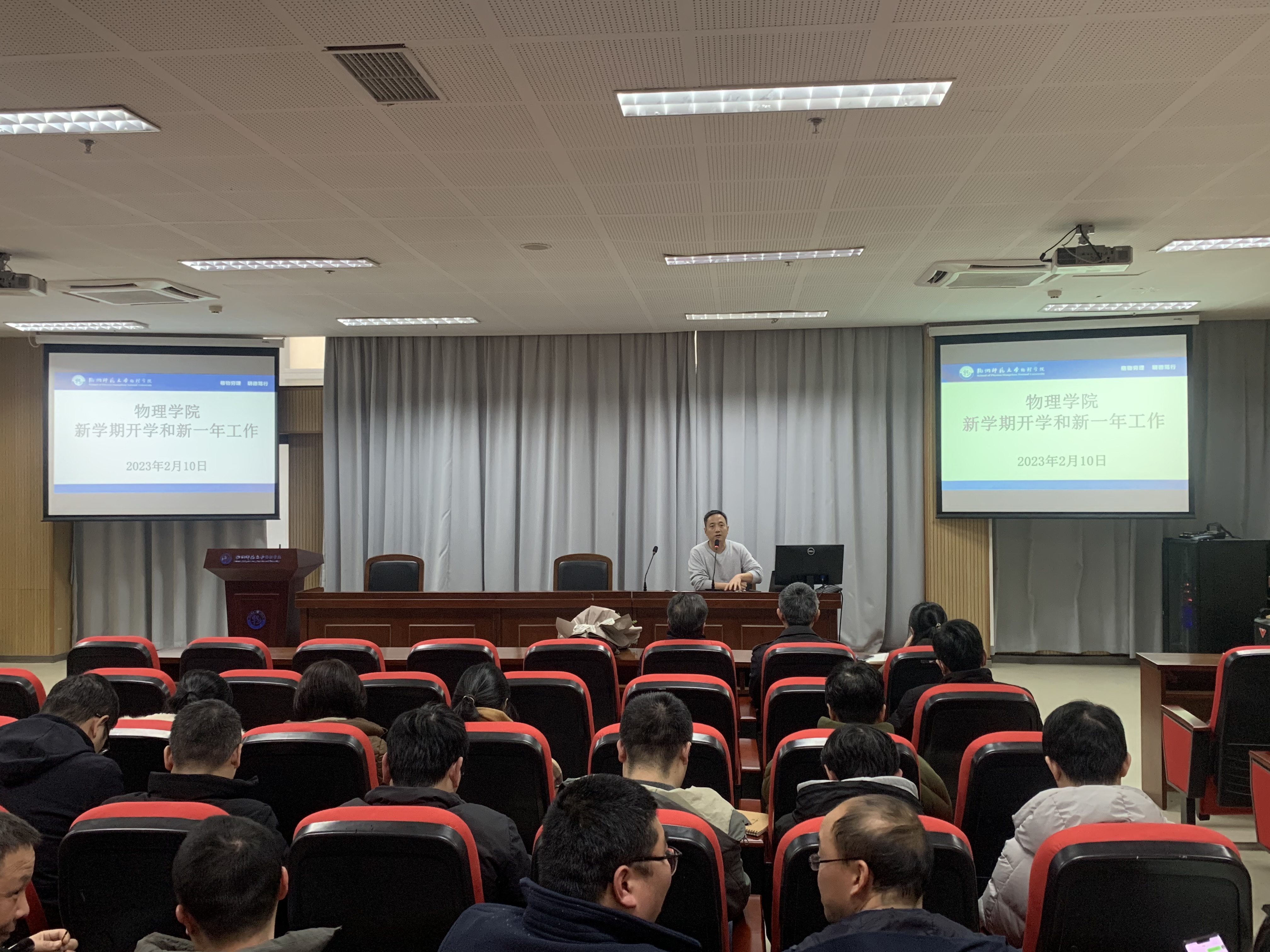 侯红生院长以物理学科建设为切入点回顾学院2022年工作,从解放思想大讨论方案落实、国家基金申报(24项)、学术交流和会议、科学教育专业师范认证工作、申博工作、教师荣誉、学院财务运行情况等方面总结过去一年取得的斐然成绩,并就2023年重点工作进行安排部署。最后,侯院长就落实争创双一流提了三个方面的要求:一是统一思想、齐心协力,在良好的氛围中推进一流学科建设,学院要在一流学科建设的路径、措施、目标上达成共识;二是把握方向、明确目标,在激烈的竞争中推进一流学科建设,全院教职工要在如何建设的认识上更加清醒、在建设的目标上更加坚定、在人才队伍建设上更加投入、在克服困难和阻力面前更加坚韧;三是加强领导、明确责任,在一流学科建设任务上狠抓落实,要做到措施方法到位,分工具体,责任到人。
