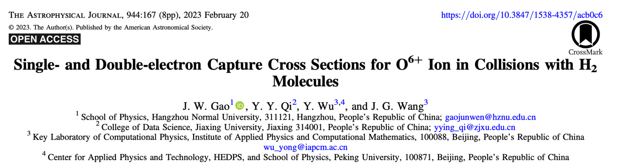 近日,果冻传媒 高俊文副教授及合作者在天体物理学领域重要的研究期刊上发表题为“Single- and Double-electron Capture Cross Sections for O6+ Ion in Collisions with H2 Molecules”的研究论文。