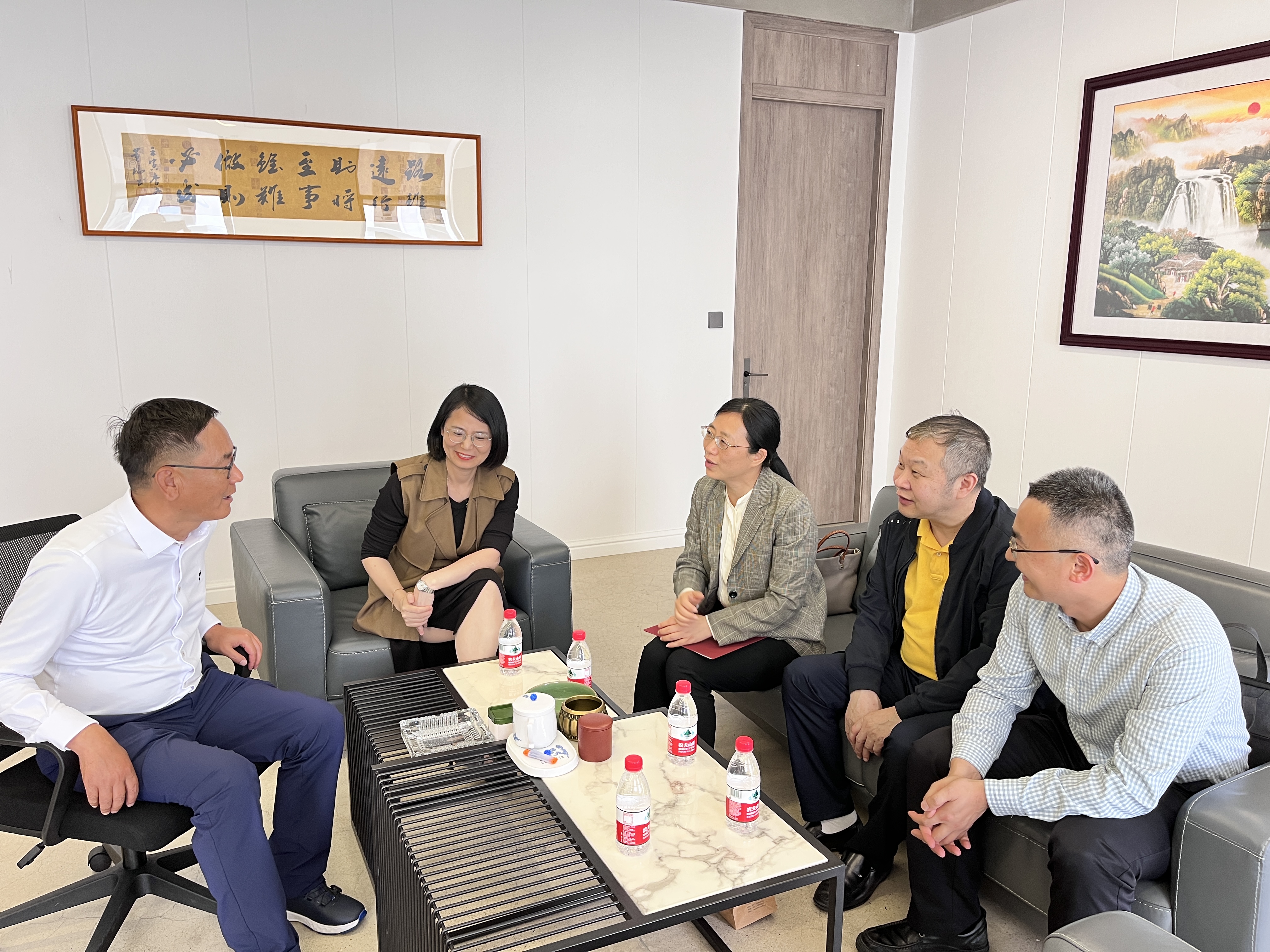 王力校友热情接待了王淑君书记一行,双方进行了座谈交流。王力对母校学院领导、老师们的到访表示热烈欢迎。他回忆起在母校求学时的难忘时光,感恩母校的培养与教育,详细介绍了他的创业历程,公司的发展战略和未来的投研方向。
