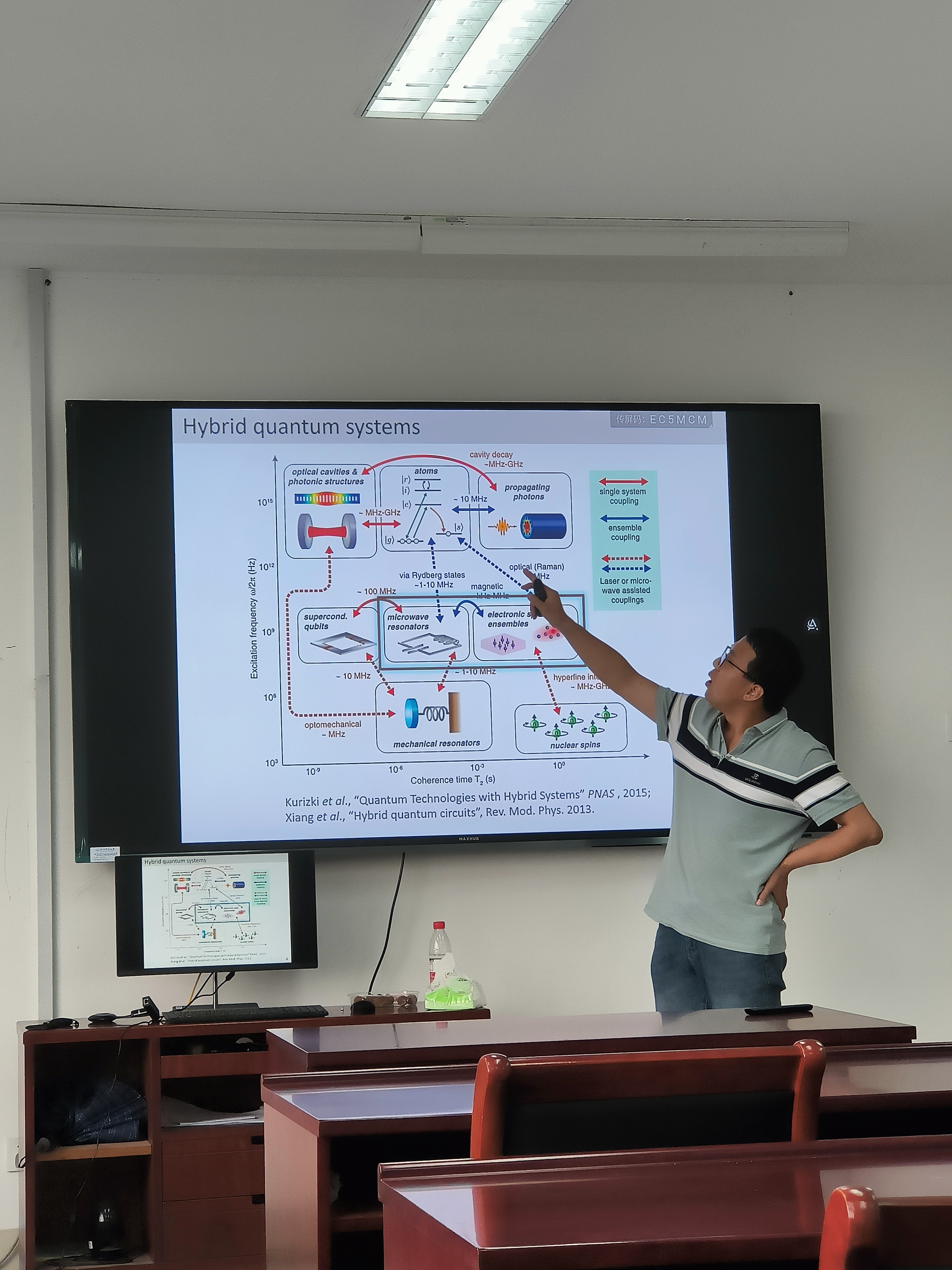 张国强老师做“腔磁振子混合系统中的双稳与相变”的报告。报告重点介绍了腔磁振子混合系统中的双稳与相变现象。基于铁磁材料中的磁晶各向异性,理论上给出了包括自旋波量子克尔效应的哈密顿量;并与实验组合作,从理论和实验两方面研究了自旋波量子克尔效应诱导的频率移动和双稳现象。在此基础上通过利用参量驱动,提出基于自旋波量子克尔效应的宇称对称破缺的量子相变理论方案。此外,给出了一种利用三阶奇异点增强克尔效应探测灵敏度的方案。此研究为设计基于磁振子克尔效应的非线性器件提供了理论依据。