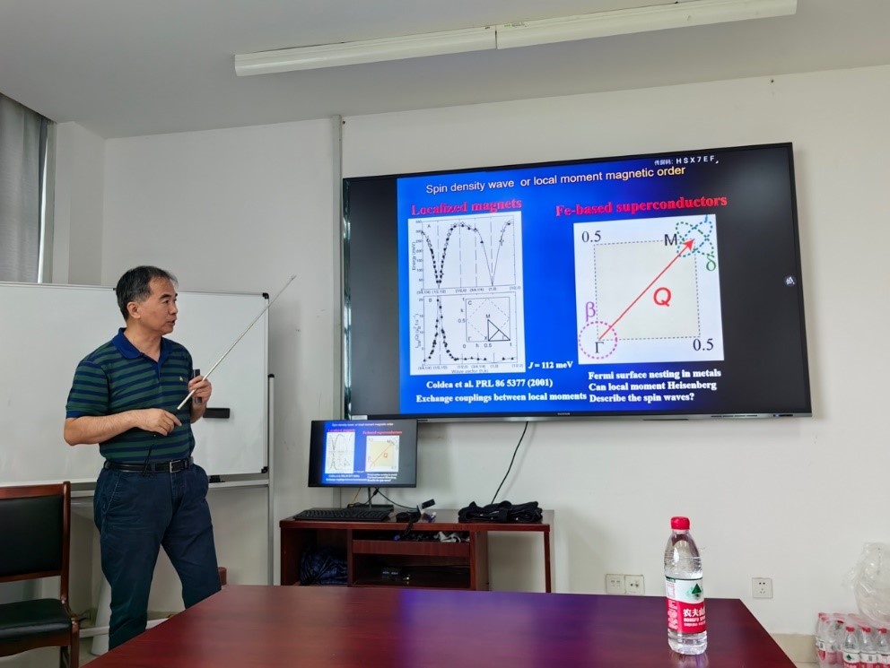 7月27日,美国莱斯大学、国际著名中子散射实验专家戴鹏程讲席教授莅临果冻传媒 开展题目为·“Competing itinerant and local spin interactions in kagome metal FeGe”的学术讲座。戴鹏程教授详细介绍并分享了他们最新的研究成果:利用非弹性中子散射探测FeGe材料中的新奇自旋激发谱,研究材料中CDW和canting温度的依赖关系[Nature 609, 490–495 (2022) ]。学术讲座吸引了来自浙江大学、西湖大学和果冻传媒 凝聚态方向各位师生的极大兴趣,研究成果的前沿性和创新性也激发了大家热烈的讨论和探讨,并积极探索未来的合作方向和课题。