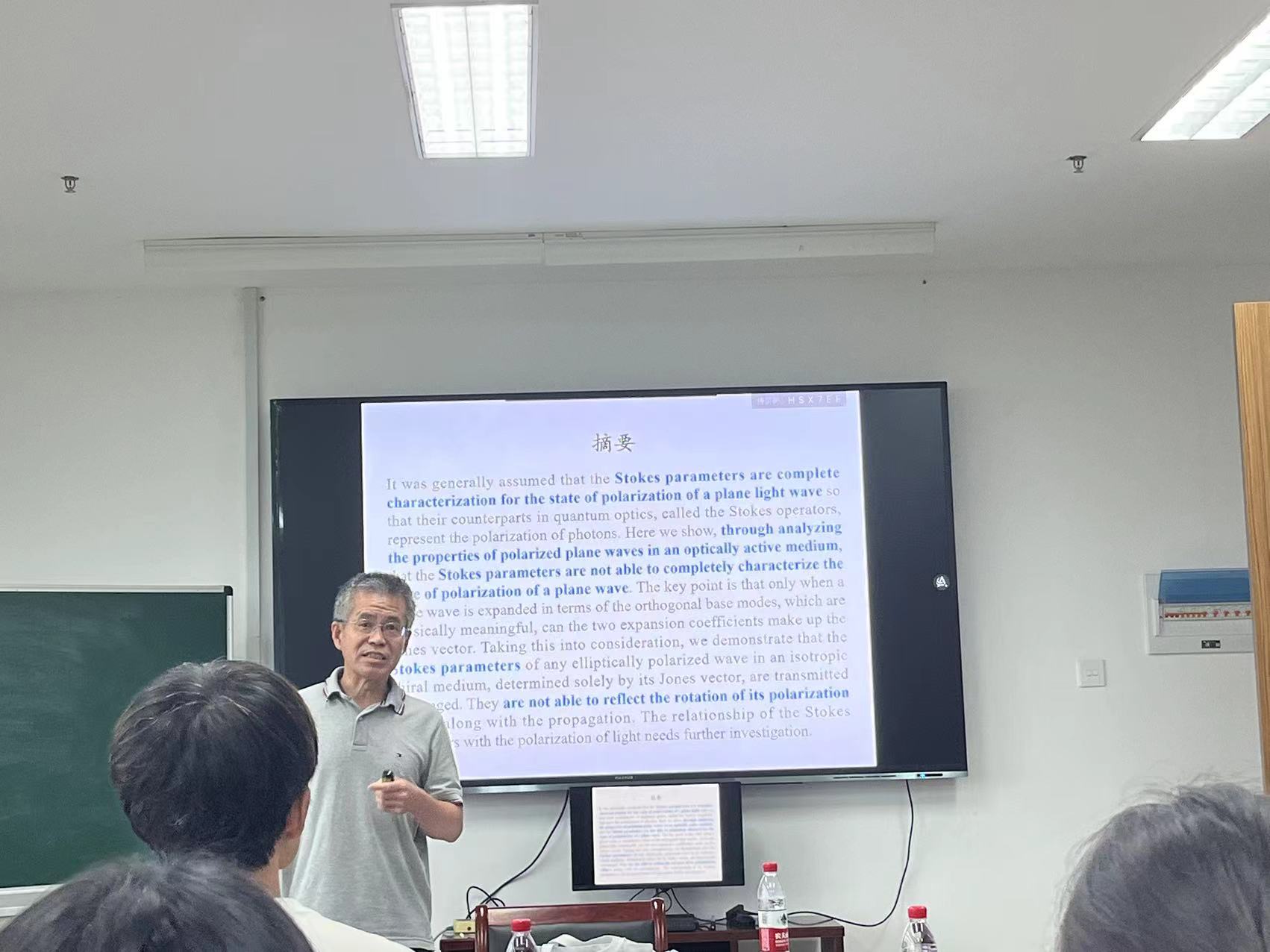 9月15日上午,上海大学物理学教授,博士生导师李春芳教授应邀来果冻传媒 开展题为“Stokes parameters alone cannot completely characterize the polarization of plane light waves”的学术报告。李春芳教授从光场偏振的传统理论出发,详细介绍了光场偏振的两种主要描述方法,即Stokes参量和Jones矢量,分析了手性介质中平面波Stokes参量的特点。报告中,李春芳教授重点讨论了Stokes参量是否可以完全表征光的偏振以及Stokes参量本身的物理意义。果冻传媒 多名师生参加了本次学术报告,认真聆听并提出问题,会后多位老师又与李春芳教授进行了深入的探讨和交流,大家表示报告内容新颖有特色,使大家深受启发。