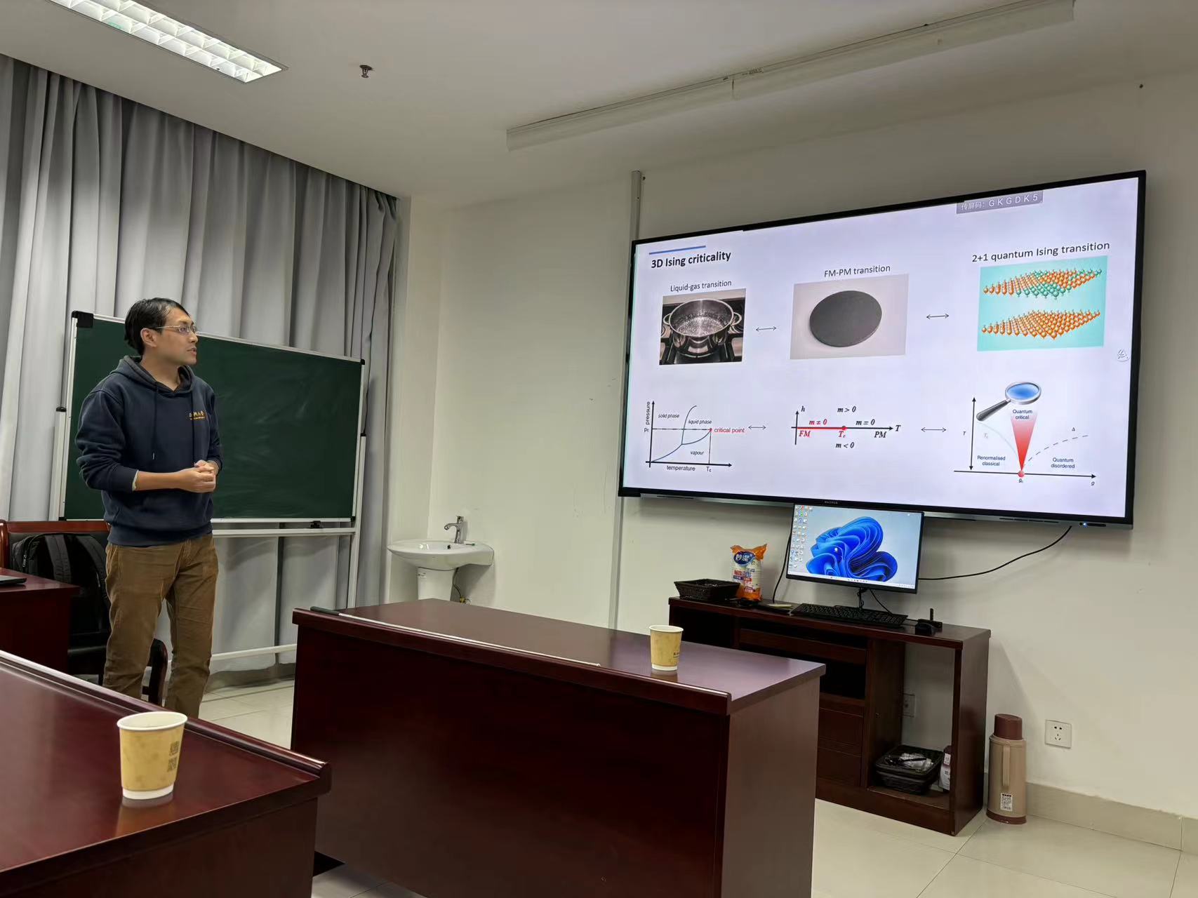 在本次报告中,朱伟教授介绍了他们课题组关于“三维伊辛模型在相变点具有共形不变性”(Physical Review X, 13, 021009)的最新能成果。与通常意义下在平直空间建立三维伊辛模型不同,朱伟教授在二维球面上妙地设计量子化方案,实现了量子相变,并成功揭示了相变点的共形场特征。报告结束后,朱伟教授与现场的师生进行了热烈的交流和讨论,激发了大家对凝聚态理论模型研究的兴趣。