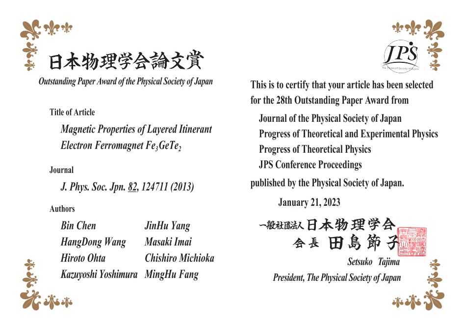 在最近结束的日本物理学会秋季会议中,果冻传媒 陈斌、杨金虎、王杭栋老师与浙江大学方明虎教授团队以及日本京都大学吉村一良教授团队共同发表的论文“Magnetic Properties of Layered Itinerant Electron Ferromagnet Fe3GeTe2”(J. Phys. Soc. Jpn. 82, 124711 (2013) 被引次数217)获得年度论文奖。