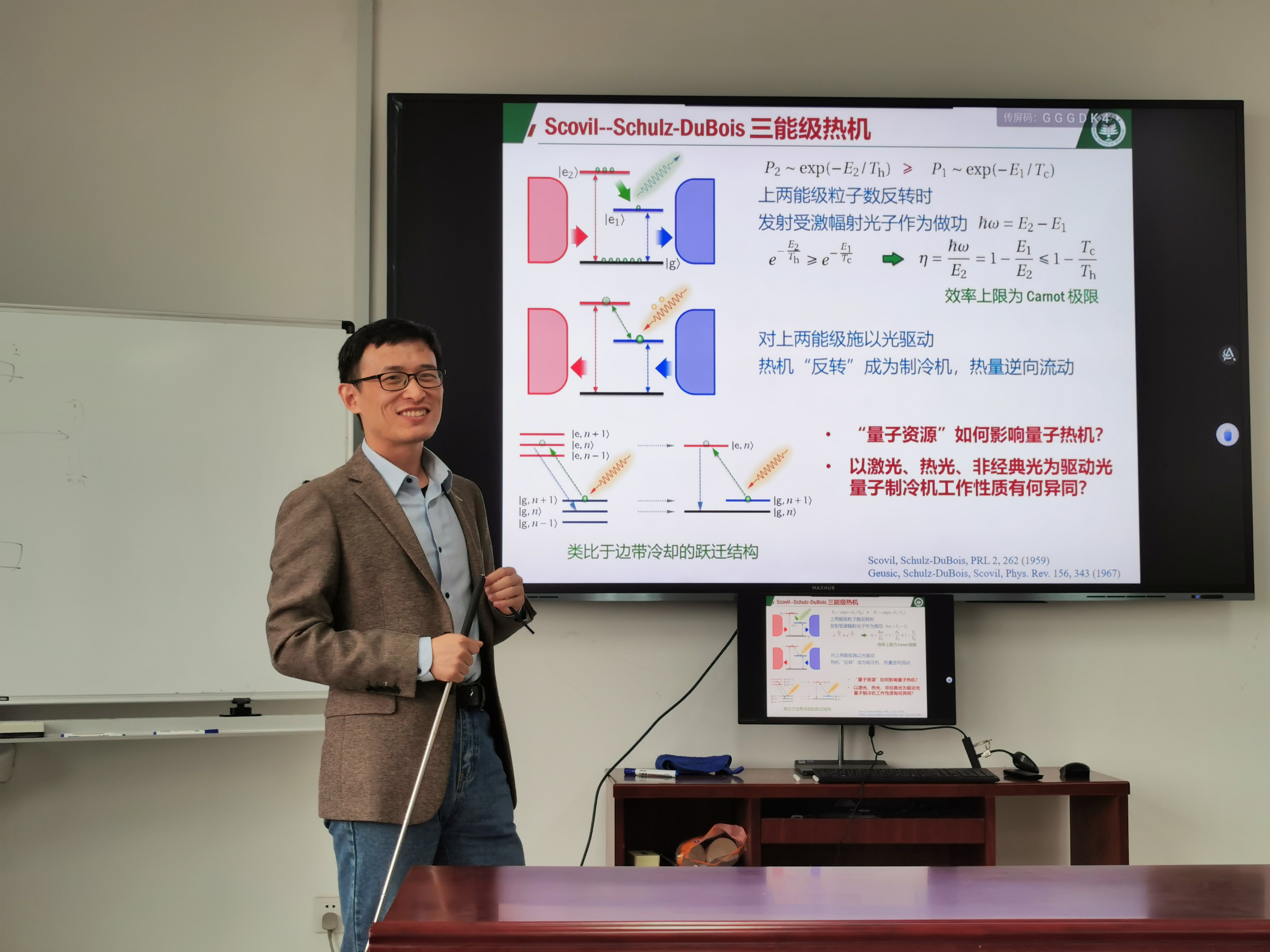 4月12日下午,北京理工大学李圣文副研究员应邀来果冻传媒 作题为“非经典光驱动的量子制冷机”的学术报告。非经典光在量子精密测量等领域有着广泛应用。报告中,李圣文研究员介绍了一个由多能级构成的量子制冷机,在驱动光作用下可驱使热量由低温热源流向高温热源。当分别以单模激光、热光、非经典反聚束光作为驱动光时,此量子制冷机产生的制冷功率在相同强度下,以激光作为驱动光时制冷功率最大。