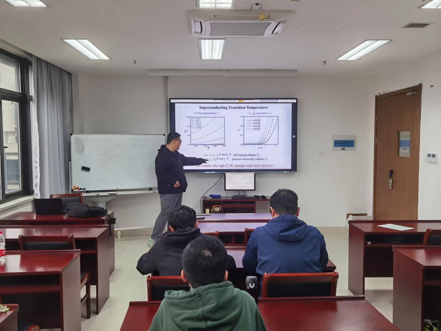 本次报告中,卢晨博士首先介绍了铜氧化物高温超导和镍基超导材料的相关历史,特别是近期在加压La3Ni2O7中发现的临界温度高达80K的超导现象,是继1986年铜氧化物高温超导体以来人类发现的第二类液氮温区的非常规超导材料。为了研究La3Ni2O7的超导机制,卢晨博士介绍了他们建立的双层两轨道t-J模型,以及利用隶玻色子平均场方法求解该模型得到的结果,与实验吻合得很好。报告过程中,卢晨博士与现场师生进行了热烈的讨论和交流,激发了师生们对镍基超导的热情,使大家受益匪浅。