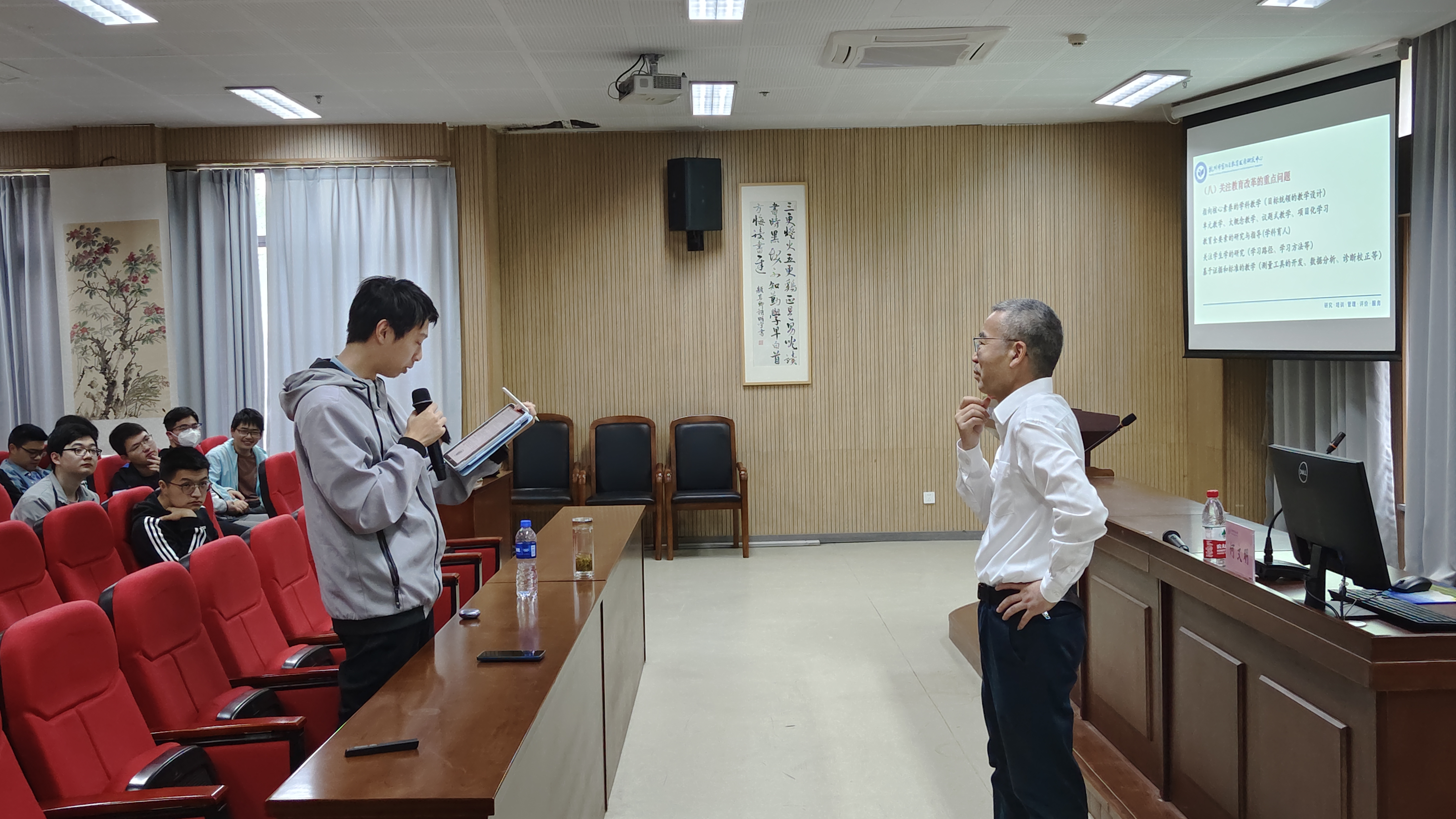 何老师以文献为基础,描绘了一条沿着历史轨迹向前发展的教育曲线,结合自己40年教研经验与经历的实例分享了他对教育发展与新时代教师成长的诸多感悟与思考。互动环节,何老师对在场同学提出的问题逐一回应,他赞赏同学们认真听讲、勤于学习的态度,勉励学弟学妹们多实践、多阅读、多思考,不断提高教学和研究能力,为成为新时代优秀教师努力。
