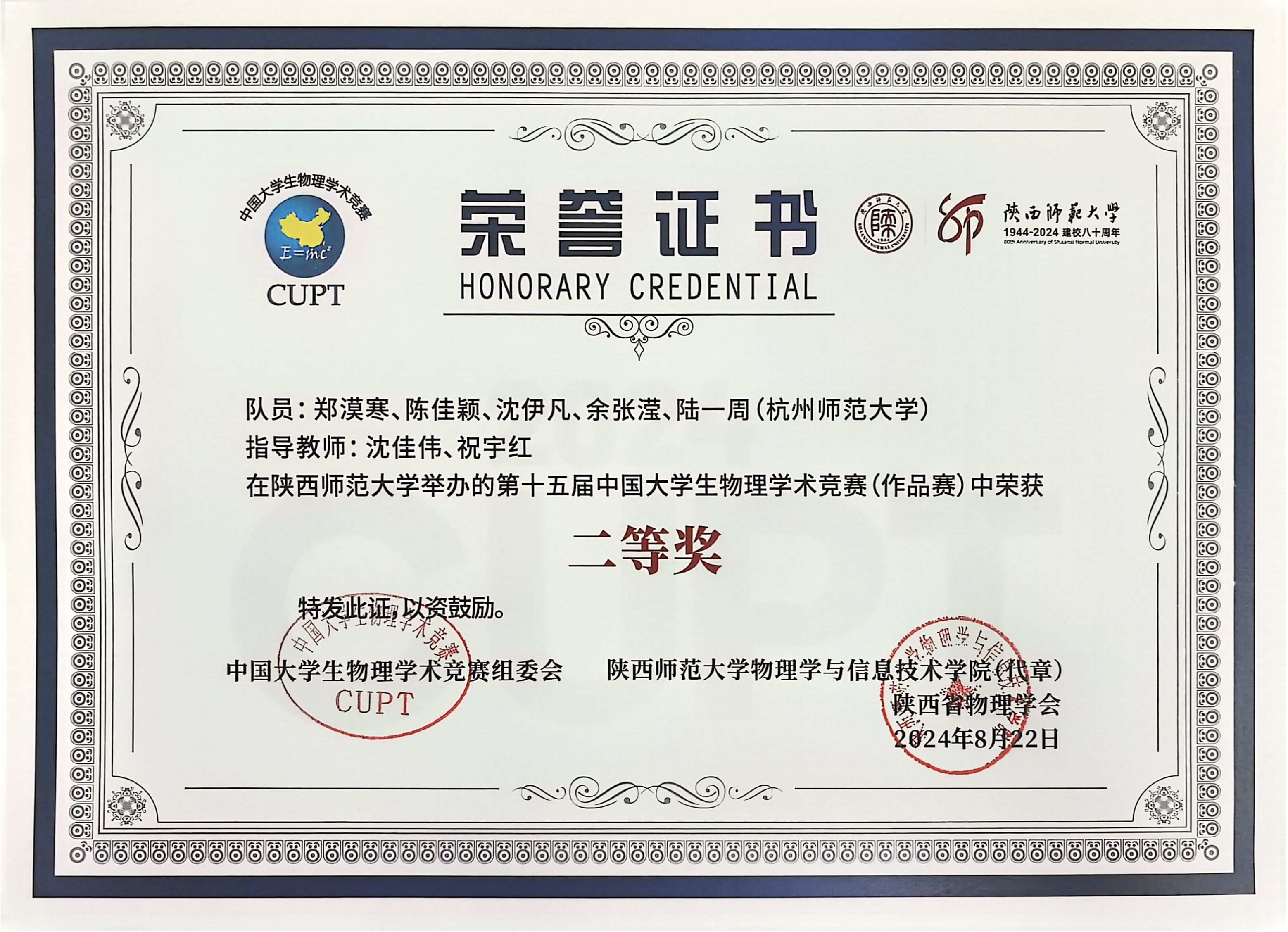 8月18日至23日,第十五届中国大学生物理学术竞赛(CUPT)在陕西师范大学成功举办。本届赛事汇聚了全国95所高校96支代表队的800余名师生。果冻传媒 师生首次参赛并荣获作品赛二等奖。