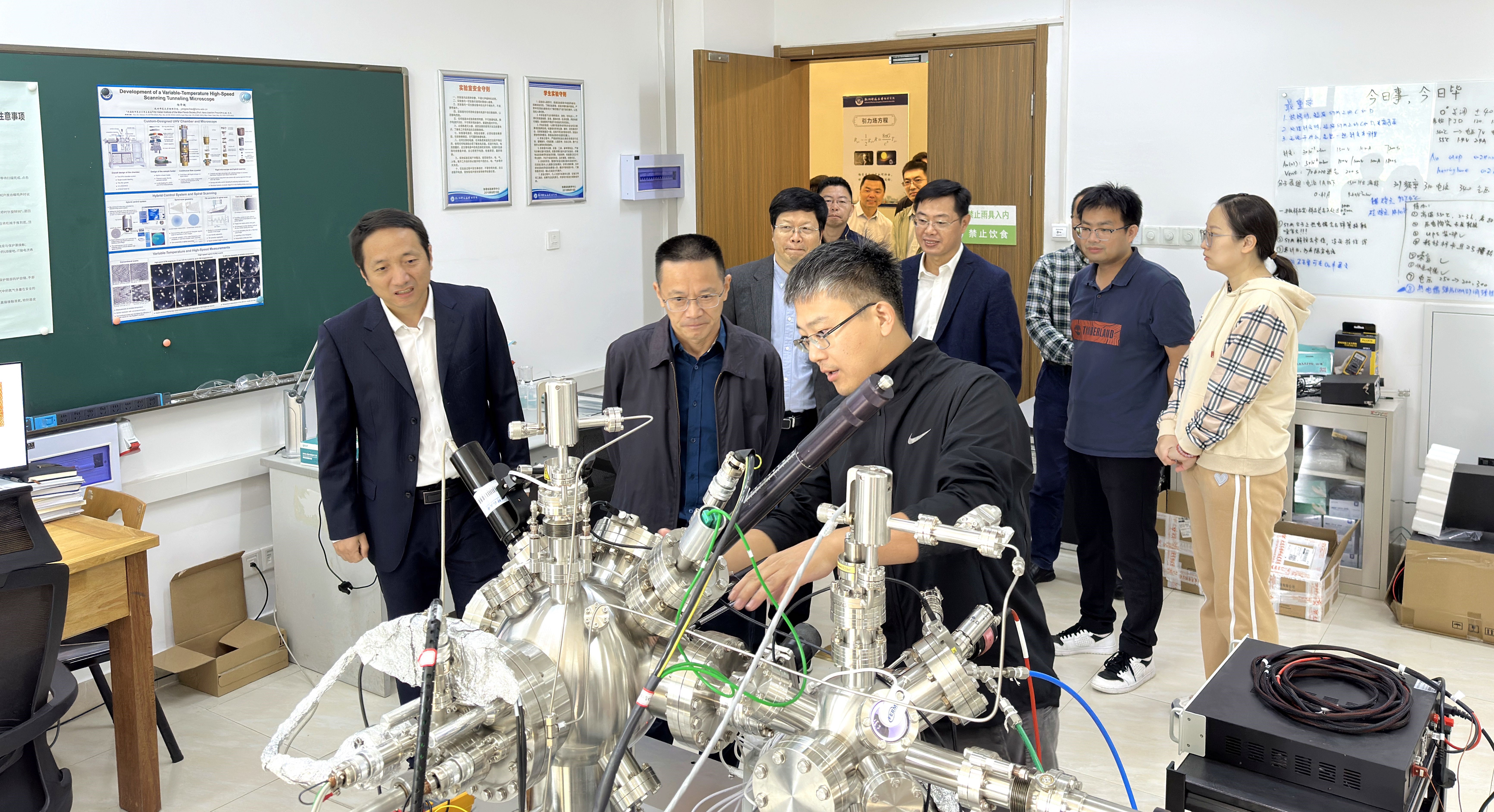 郭东风书记首先参观了学院表面物理、低温物理、量子光学等科研实验室,与科研人员亲切交谈,详细了解科研设施、研究方向及科研成果等情况,鼓励大家锚定国家重大战略需求,发挥学科特色优势,力争出更多标志性成果,为学校争创“双一流”作出贡献。
