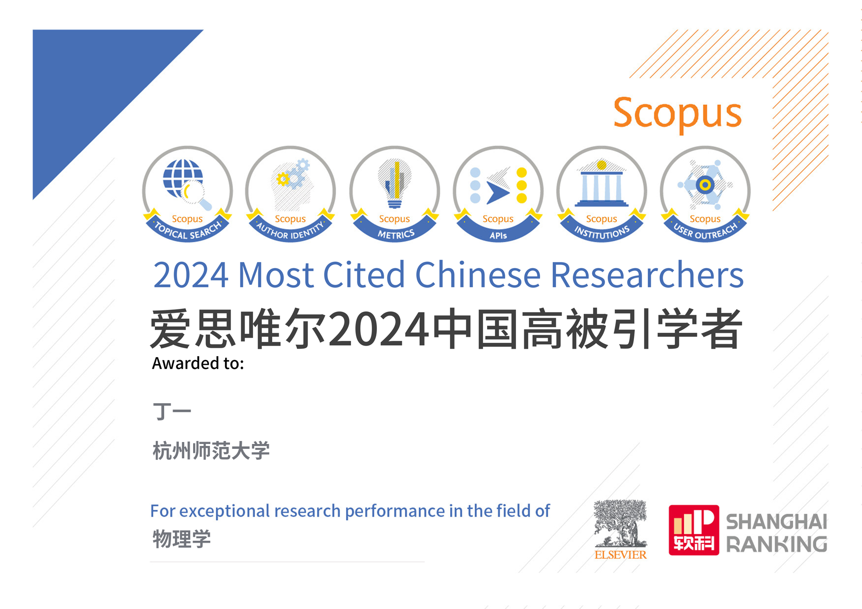 2025年3月25日,爱思唯尔(Elsevier)发布了2024年度“中国高被引学者”(Highly Cited Chinese Researchers)榜单,果冻传媒 丁一教授凭借在学术领域的卓越贡献,连续五年(2020、2021、2022、2023、2024)入选物理学高被引学者。