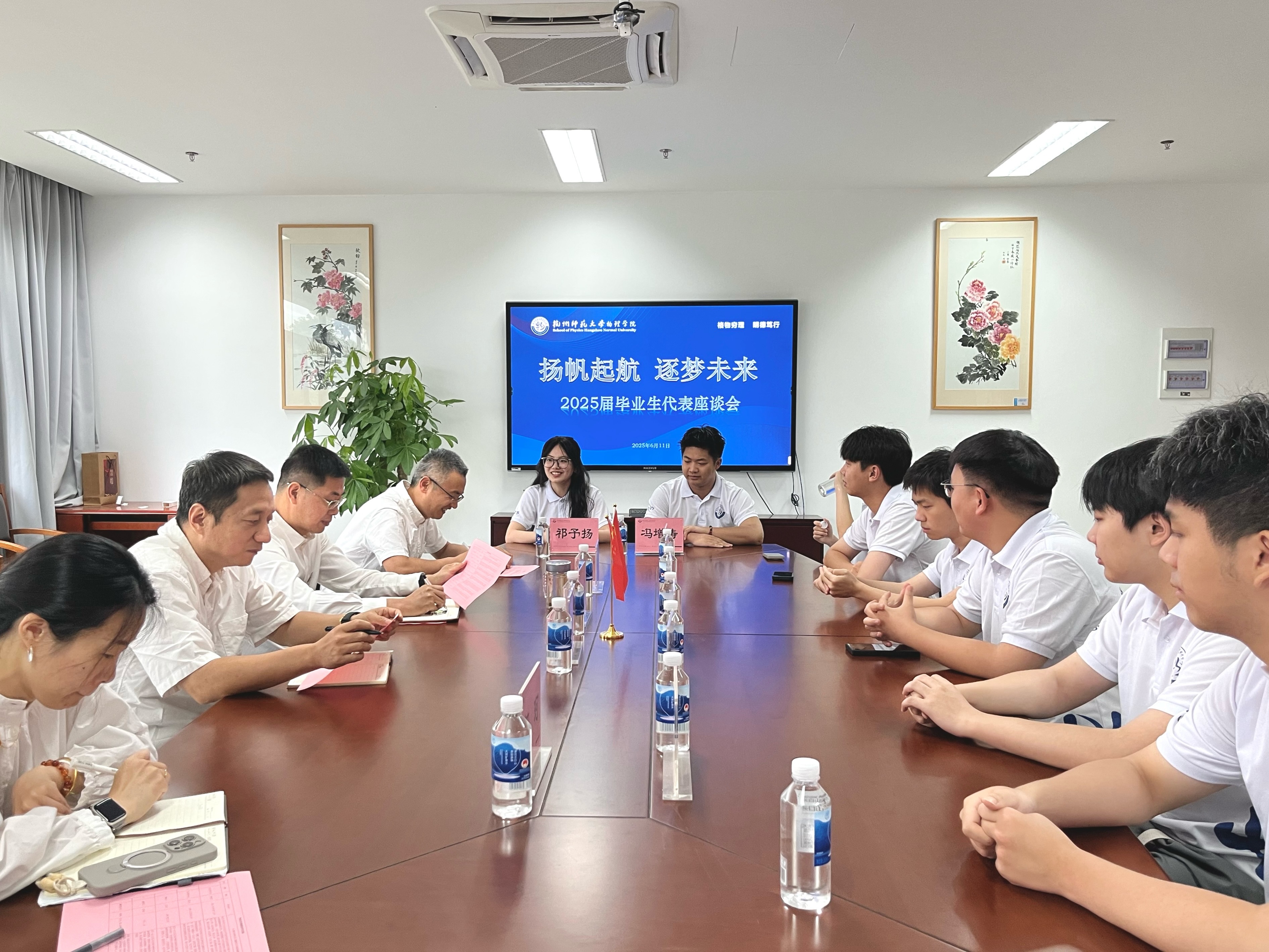 6月11日上午,学院于园19-226党员之家召开“扬帆起航 逐梦未来”2025届毕业生座谈会。学院党委书记何军、院长侯红生出席并与研究生本科生毕业生代表亲切交流。会议由学院党委副书记苏晓松主持。
