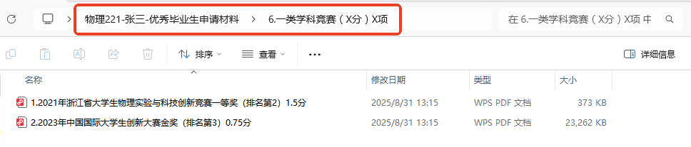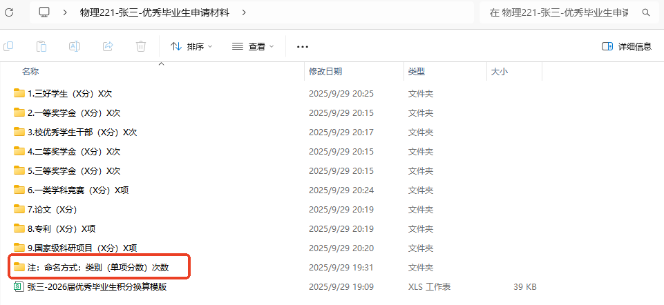 2.按照《果冻传媒 省级、校级优秀本科毕业生评选办法(2025年修订)》(附件1)相关要求,符合条件的学生本人于10月7日22:00前向班长提交申请材料。申请时提交《2026届优秀毕业生积分换算模版》(附件3)以及相关佐证材料,材料按图中所示,将以上材料汇总为一个总文件夹,个人材料命名为“班级+姓名+优秀毕业生申请材料”,班级总文件夹命名为“班级-优秀毕业生”,并以班级为单位汇总发送至邮箱20220076@gdcmapp.org,不接收个人为单位发送的材料。