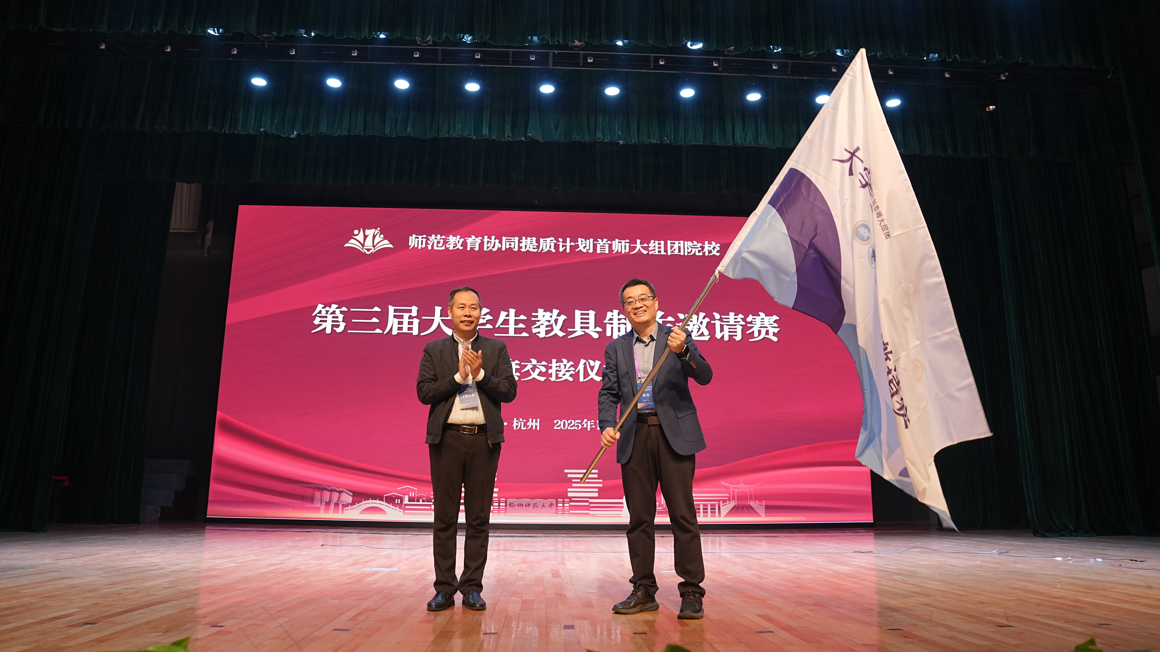 颁奖典礼上,还举行了大赛赛旗交接仪式。师范教育协同提质计划首师大组团院校第四届大学生教具制作邀请赛将由曲阜师范大学主办。