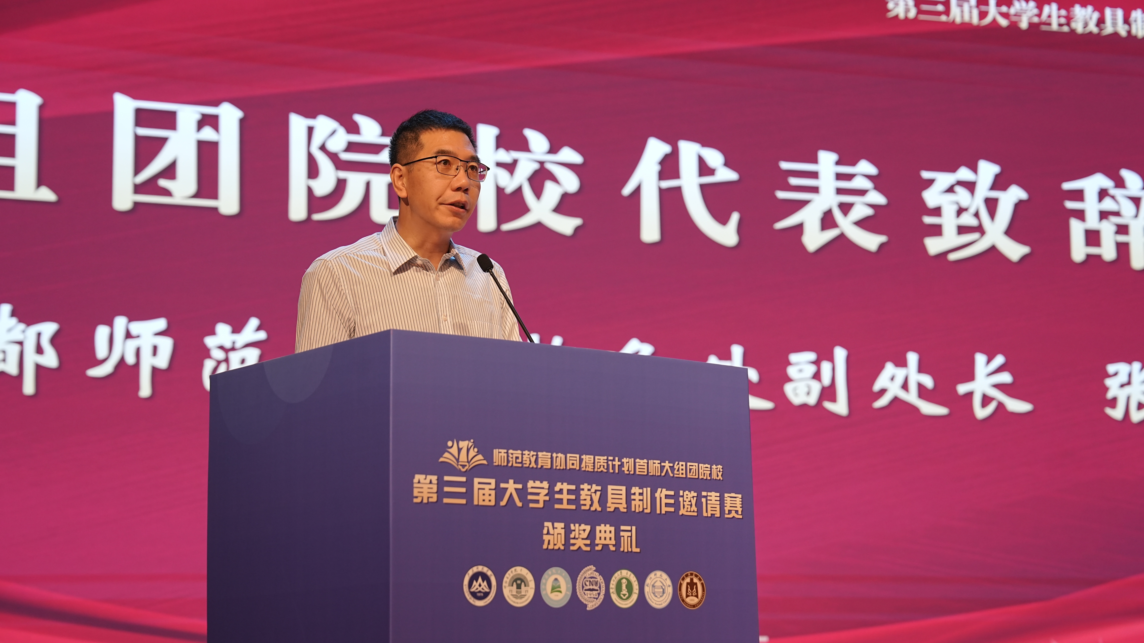 首都师范大学领队、教务处副处长张成代表组团进行致辞。张处长指出,本次教具大赛,是各校深化协作、共促提升的生动实践,未来将以此次大赛为契机,进一步推进协同提质计划,加强校际合作,促进资源互通,实现教具创新与教学实践的深度融合。