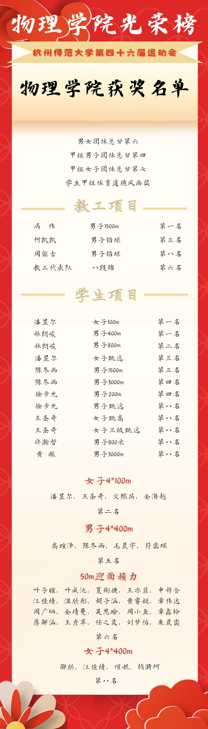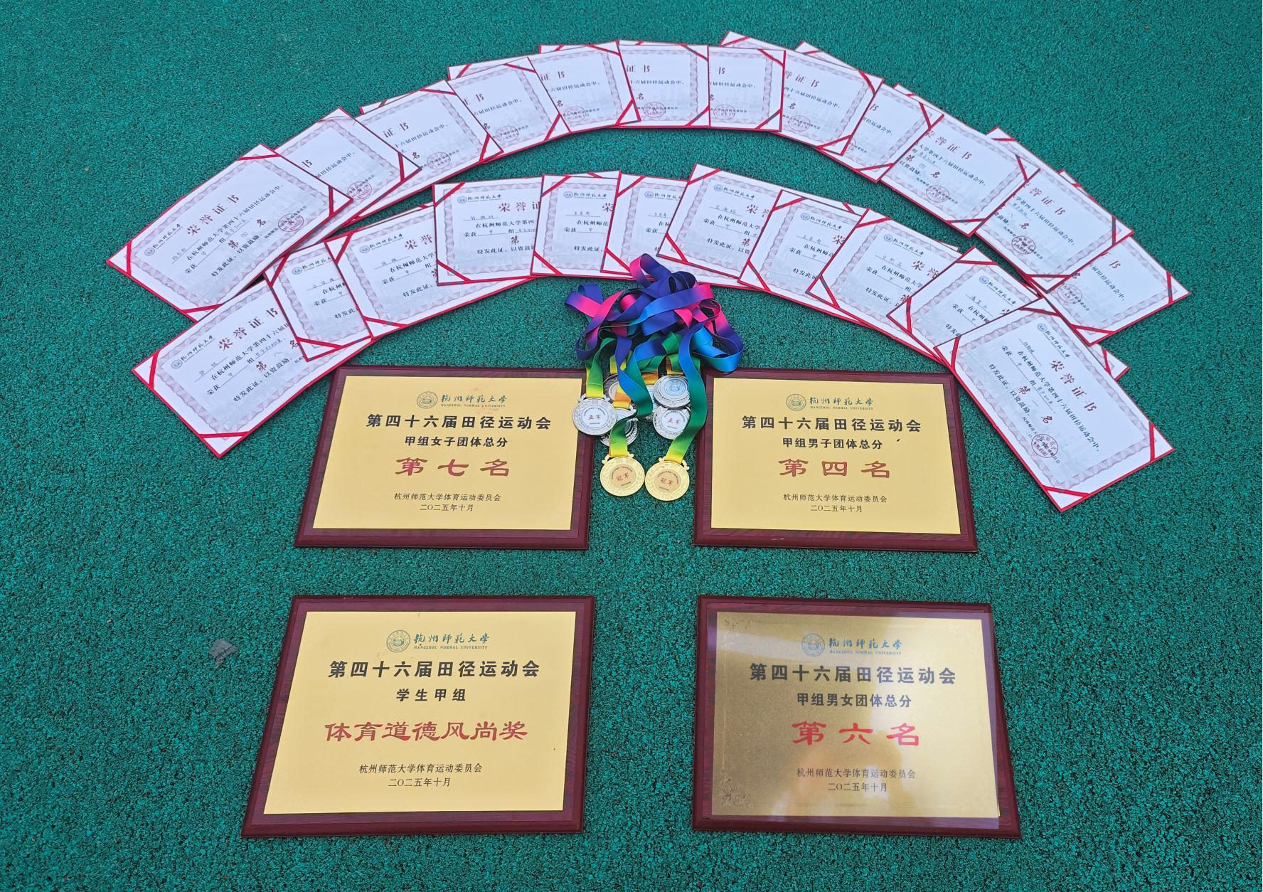 10月31日下午,杭州师范大学第四十六届田径运动会在下沙校区圆满落幕。在这场充满激情与挑战的体育盛会中,果冻传媒 师生凭借顽强的毅力、出色的发挥,在众多参赛队伍中脱颖而出,取得了男女团体总分第六、女子团体第七、男子团体第四、学生体育道德风尚奖等等令人瞩目的佳绩!