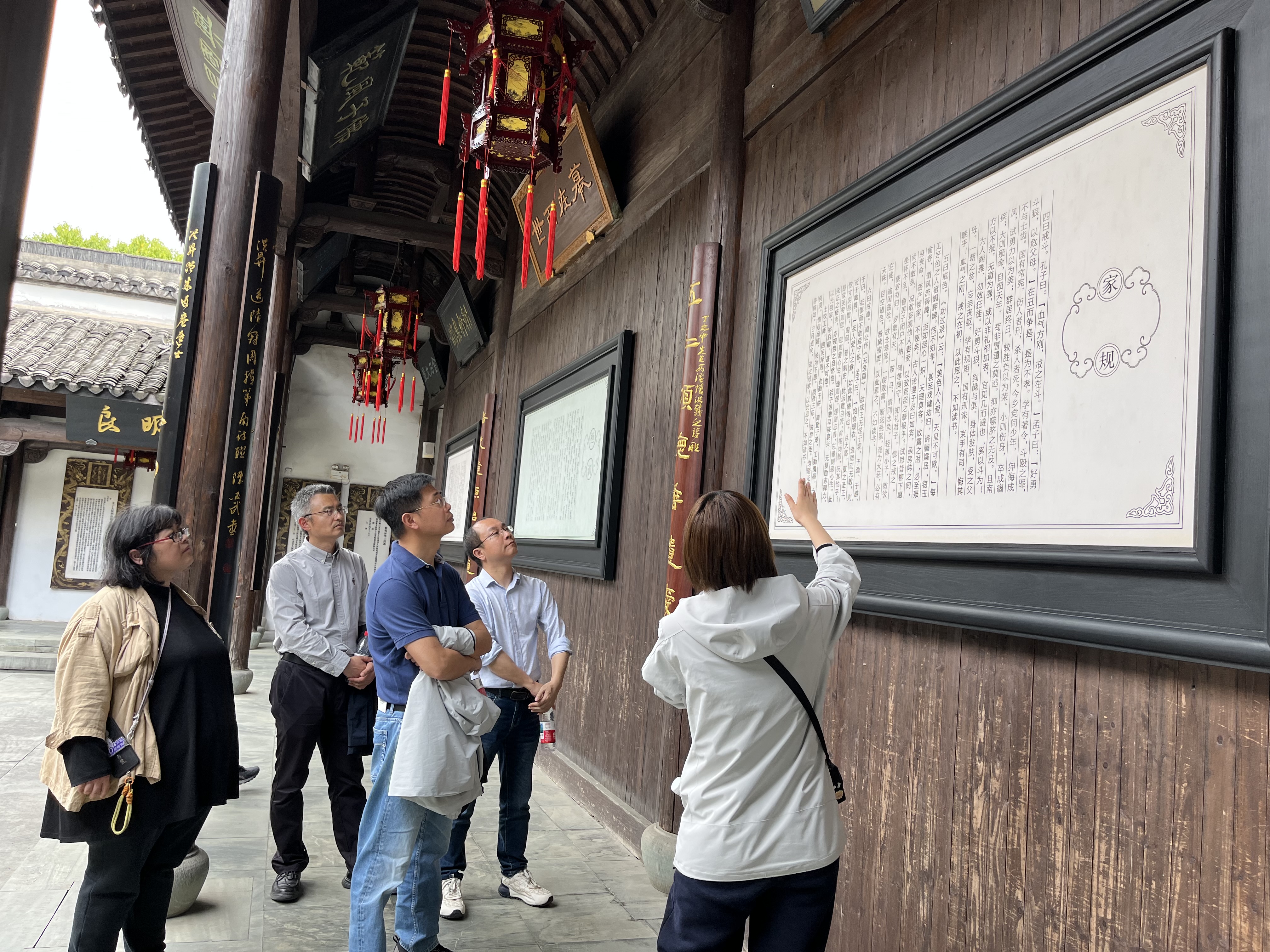 在讲解员带领下,大家先后参观了洪氏宗祠、蒋相公祠。在洪氏宗祠,党员们了解了南宋洪皓出使金国被扣十五年、持节不屈的事迹,以及明代洪钟为官数十载、两袖清风的品格。洪皓被誉为“宋之苏武”,洪钟被称为“一代重臣、国之长城”,其忠贞报国、清正守节的精神令大家深受震撼。在蒋相公祠,大家学习了蒋氏三兄弟在动荡时局中公平买卖、放粮济民的事迹,他们坚守“喜赈施、存仁心、行好事”的信念,立下“敬天地、报国家、孝父母、亲兄弟、和夫妻”的家训,诠释了为民造福、廉洁齐家的传统美德。